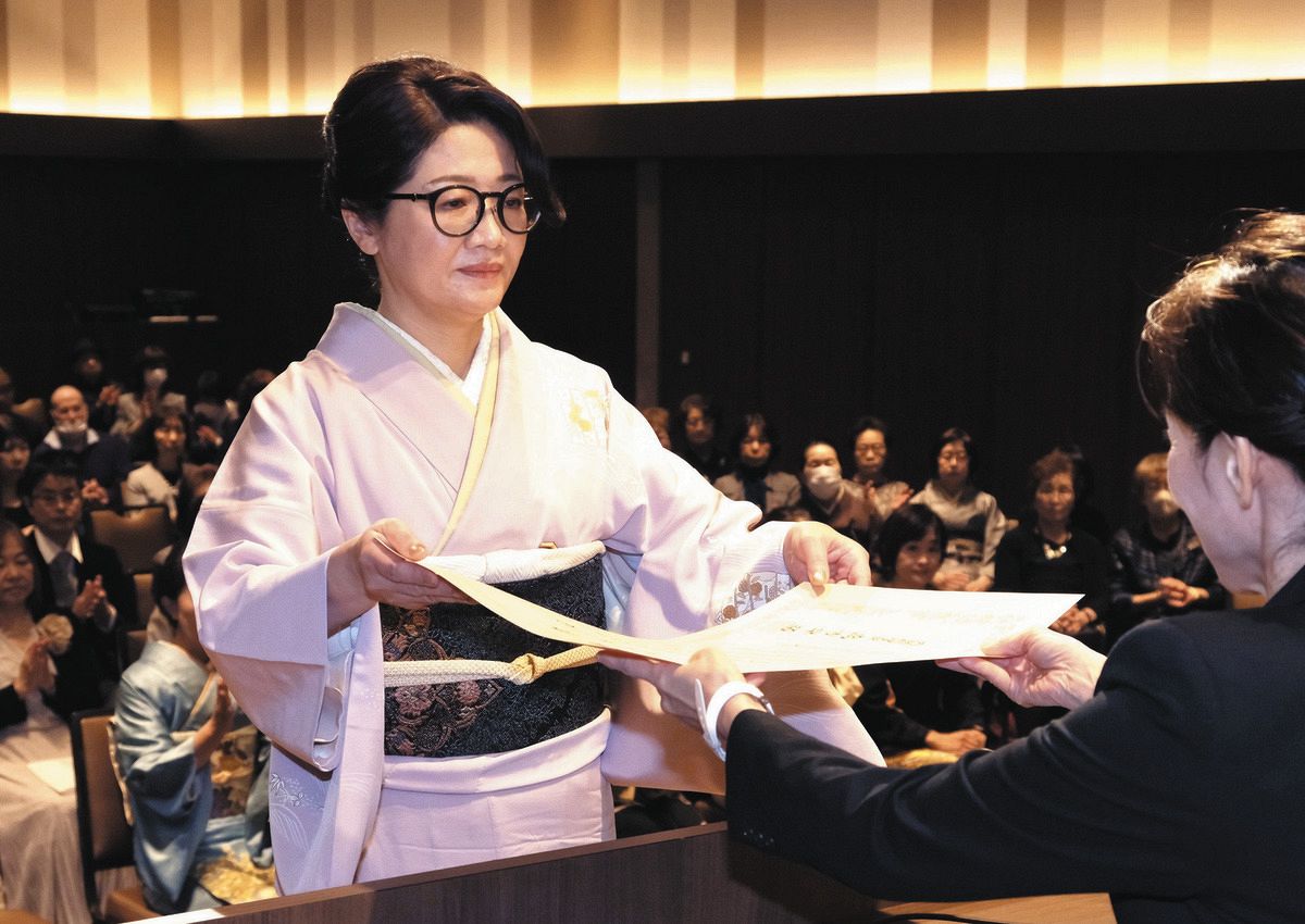 内閣総理大臣賞・東京書作展大賞を受賞し、賞状を受け取る真野藤仙さん=東京都台東区の東天紅で(坂本亜由理撮影)