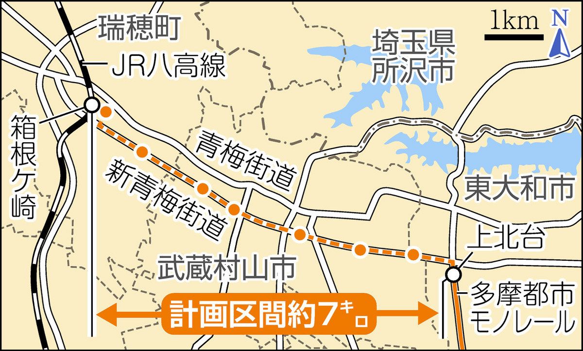 東京都は27日、多摩都市モノレールの上北台駅(東大和市)から箱根ケ崎(瑞穂町)方面への延伸について、2034年度の開業を目指すと発表した。同日、国土交通省の事業認可を取得し、用地買収などに着手する。都と多摩都市モノレール(本社・立川市)が共同で整備し、事業費は同社負担分を含め総額1290億円を見込む。