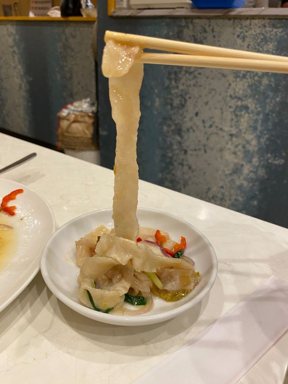 ニベの切り身を、その名の通り叩き、紙のような薄さになるまで平らにする。それを短冊状に切って平打ち麺のようにしてから、白菜やタマネギと一緒に塩とお酒で炒める。