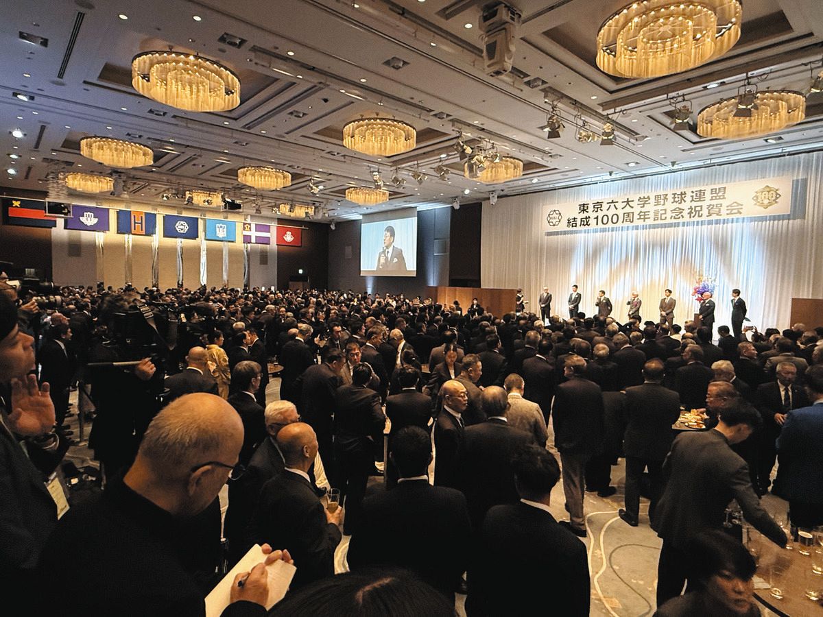 東京六大学野球連盟は、1925(大正14)年に早稲田、慶応義塾、明治、法政、立教、東京の6大学で結成された日本最古の大学野球リーグ。今年他界した長嶋茂雄さん(立教大―巨人)を始め、多くの名選手を輩出。野球殿堂入りしている222人のうち、118人が六大学関係者で、プロアマを通じて野球振興に貢献してきた。戦時中の中断はあったものの100周年を迎えた今年は、レジェンドOBによる始球式や野球殿堂博物館での記念展、オールスター東西対抗戦などの記念行事がめじろ押しで、祝賀会はその最後を飾った。