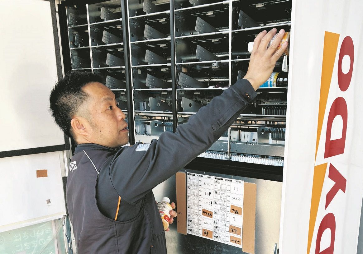 ルートセールス歴10年の中里悠一所長(48)が自販機での作業を見せてくれた。扉を開け、缶コーヒーや水を一度に両手で4〜5本持ちながら、中で詰まらないよう地面に平行にしたまま手際良く滑り落としていく。かご2箱にあった計160本は3分ほどで補充された。