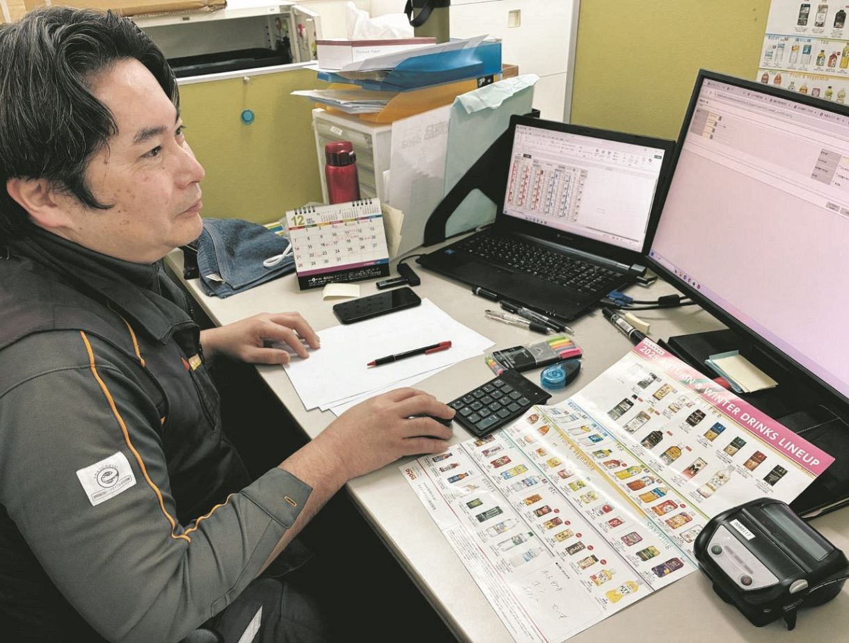 営業所では、副所長の木村俊之さん(48)がパソコンとにらめっこしていた。ダイドーが2019年以降に導入したデジタル化の取り組み「スマート・オペレーション」だ。自販機1台ずつに通信機能を付け、機内の商品在庫状況を営業所でリアルタイムに把握できるようになった。人工知能(AI)の指示を参考に、ルートセールスが翌日回る自販機ルート、各機にどの商品を何本補充するかを決めていた。