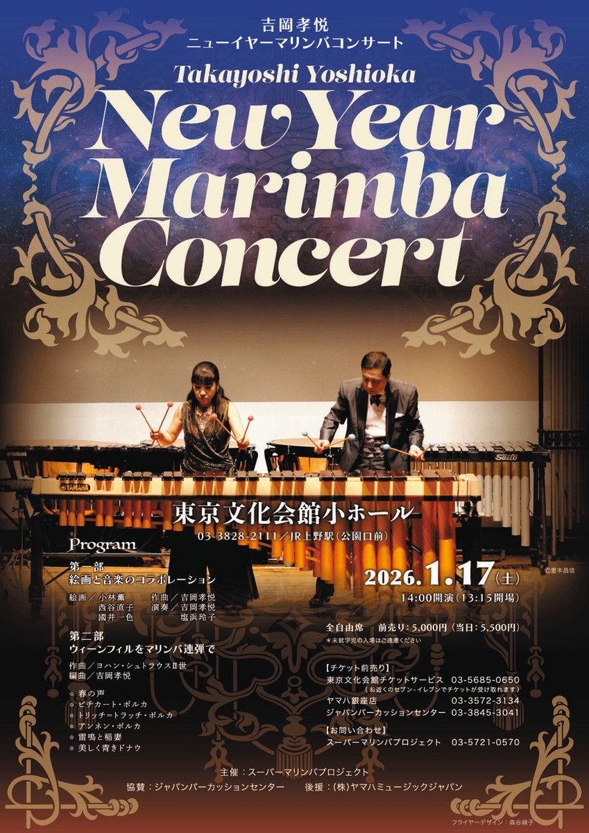 マリンバの美しい音色と名曲を楽しむ「吉岡孝悦ニューイヤーマリンバコンサート」が来年1月17日、東京・上野の東京文化会館小ホールで開かれ、読者50組100人を招待する。14時開演(13時15分開場)。全席自由。前売り5千円。当日5500円。未就学児は不可。出演は吉岡孝悦さんと塩浜玲子さん。