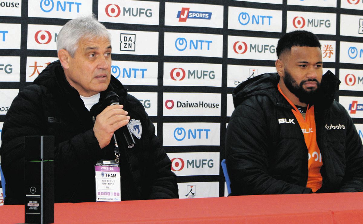 記者会見で東京SG戦を振り返る東京ベイのルディケ・ヘッドコーチ(左)とマキシ主将=27日、東京・秩父宮ラグビー場で(武藤康弘撮影)