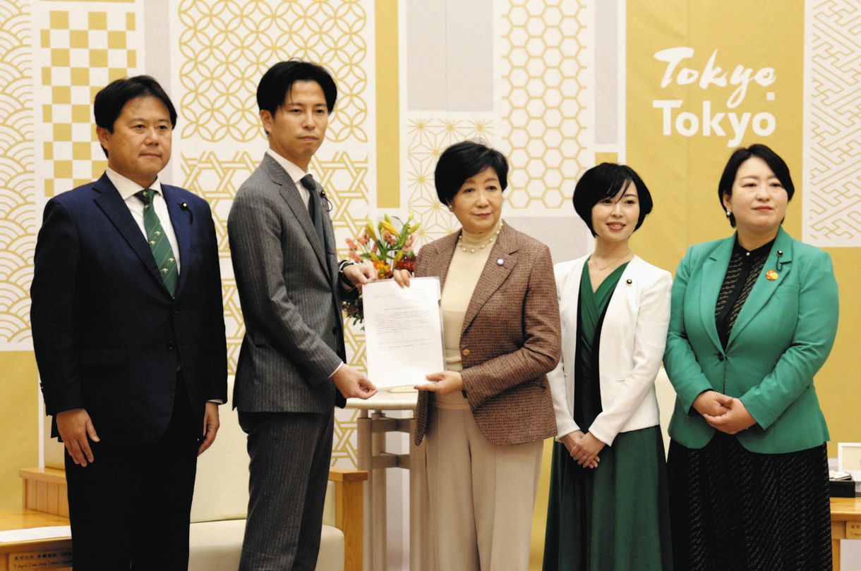 小池百合子知事(中)に今夏の水道基本料金の無償化を要望した都民ファーストの会の議員ら