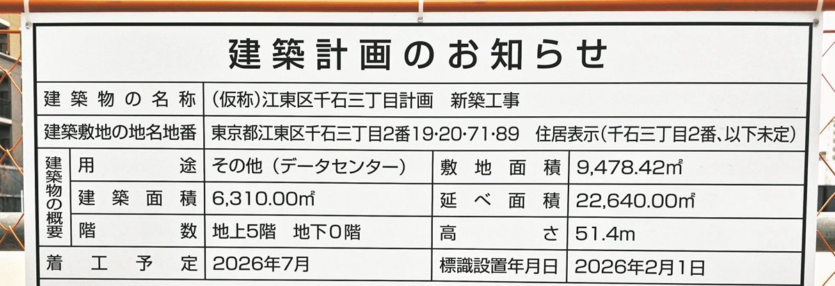 東京都江東区千石3のDCの建設計画を示す標識=東京都江東区で