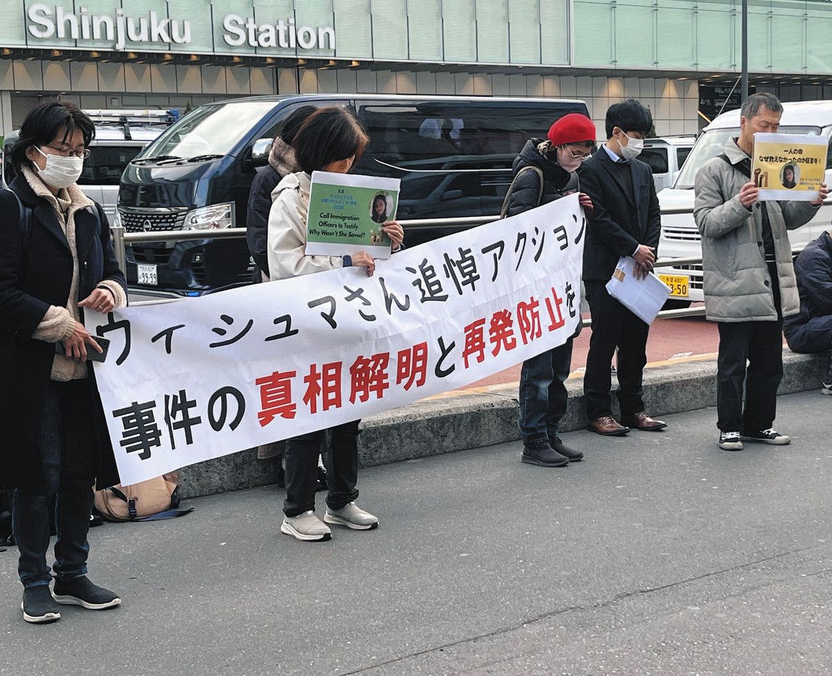 ウィシュマさん追悼活動で、死を悼み黙とうする人たち=新宿駅前で