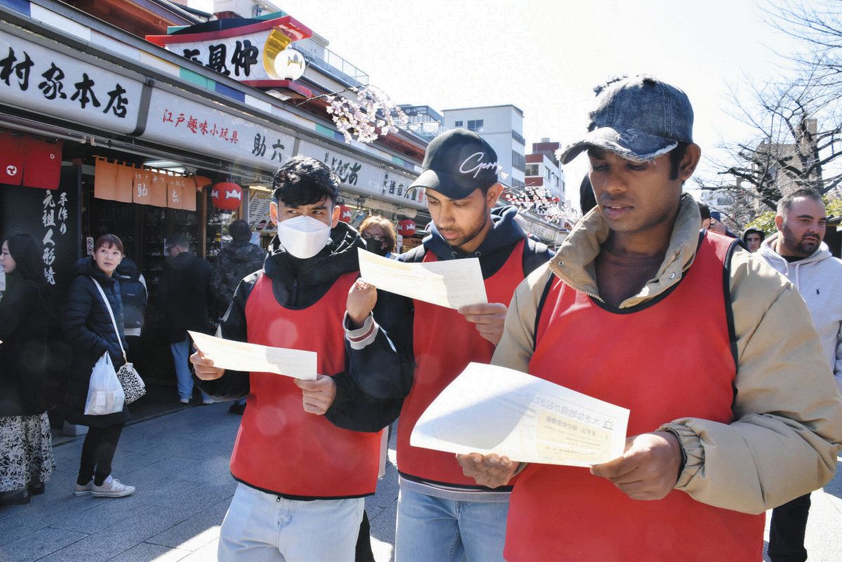 東日本大震災から11日で15年になるのを前に、外国人観光客らでにぎわう東京都台東区浅草で5日、大規模地震の発生に備え、帰宅困難者や観光客に対応する訓練があった。約600人が参加して災害時の行動を確認した。