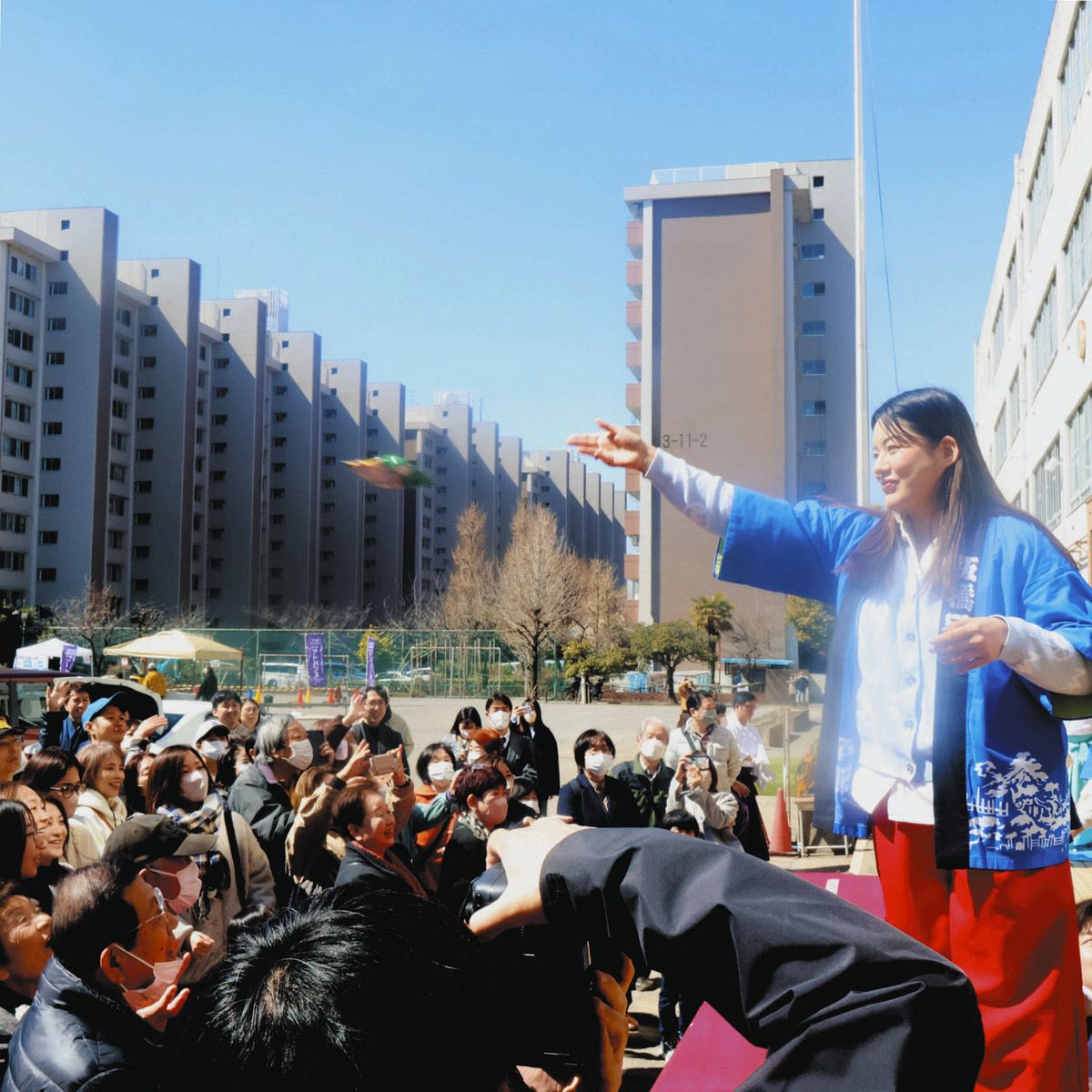 棟下式で大勢の人に向け菓子をまく参加者。奥は分譲団地=東京都板橋区の旧高島第七小学校で