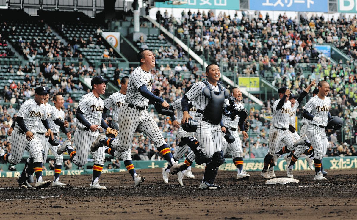 昨夏の王者・沖縄尚学を逆転で破り、駆け出す帝京ナイン=甲子園球場で