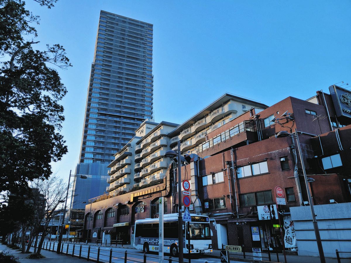 大崎西口の駅前に立つマンション「ニュー大崎」(手前)。駅前の古いマンションが再開発に狙われている