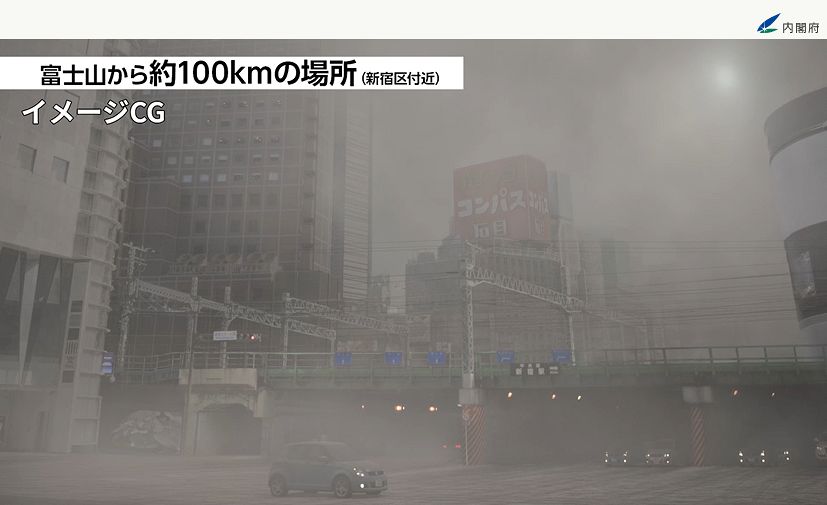 富士山が大規模噴火した場合に想定される新宿区付近の降灰イメージCG(内閣府が作成した動画よりスクリーンショット)