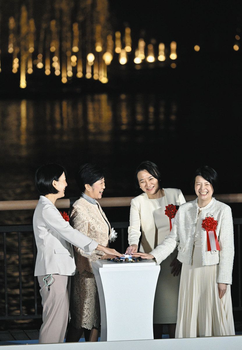 「東京アクアシンフォニー」初日、噴水のスイッチを押す小池知事(左から2人目)ら