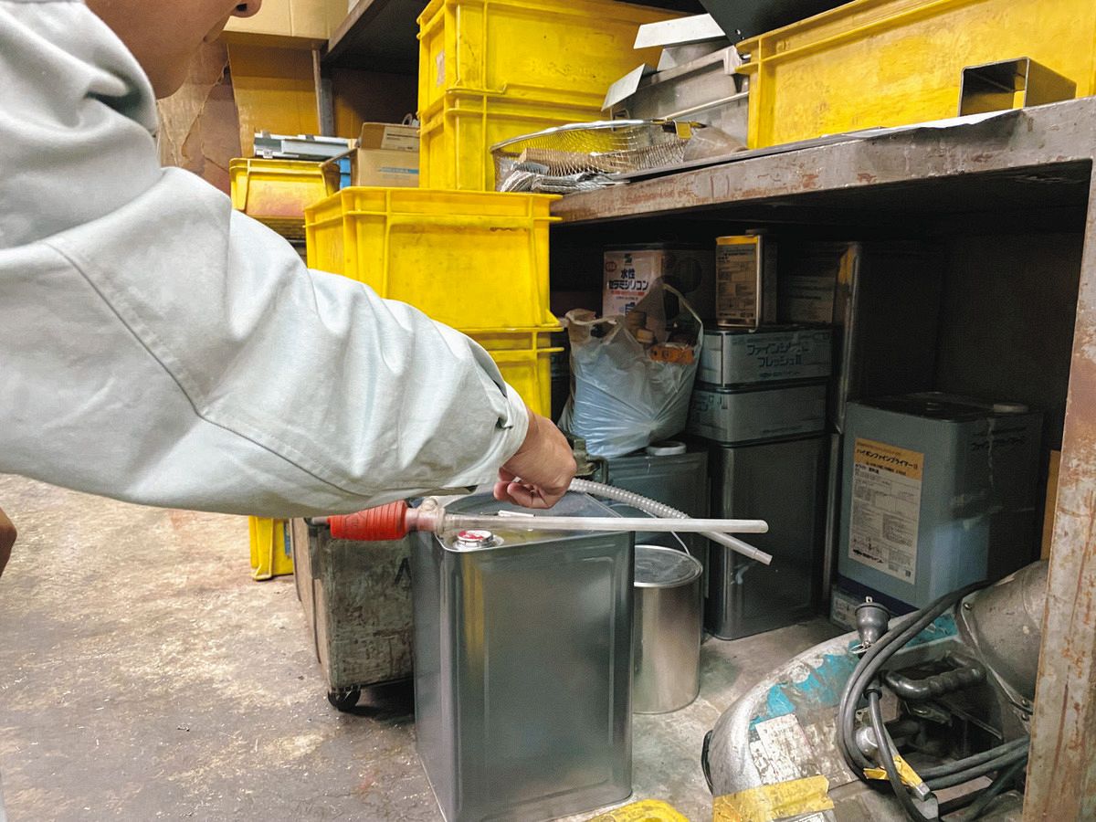 製造業に不可欠な工業用シンナー。経営者は今後の供給不安を懸念している=3月30日、都内で
