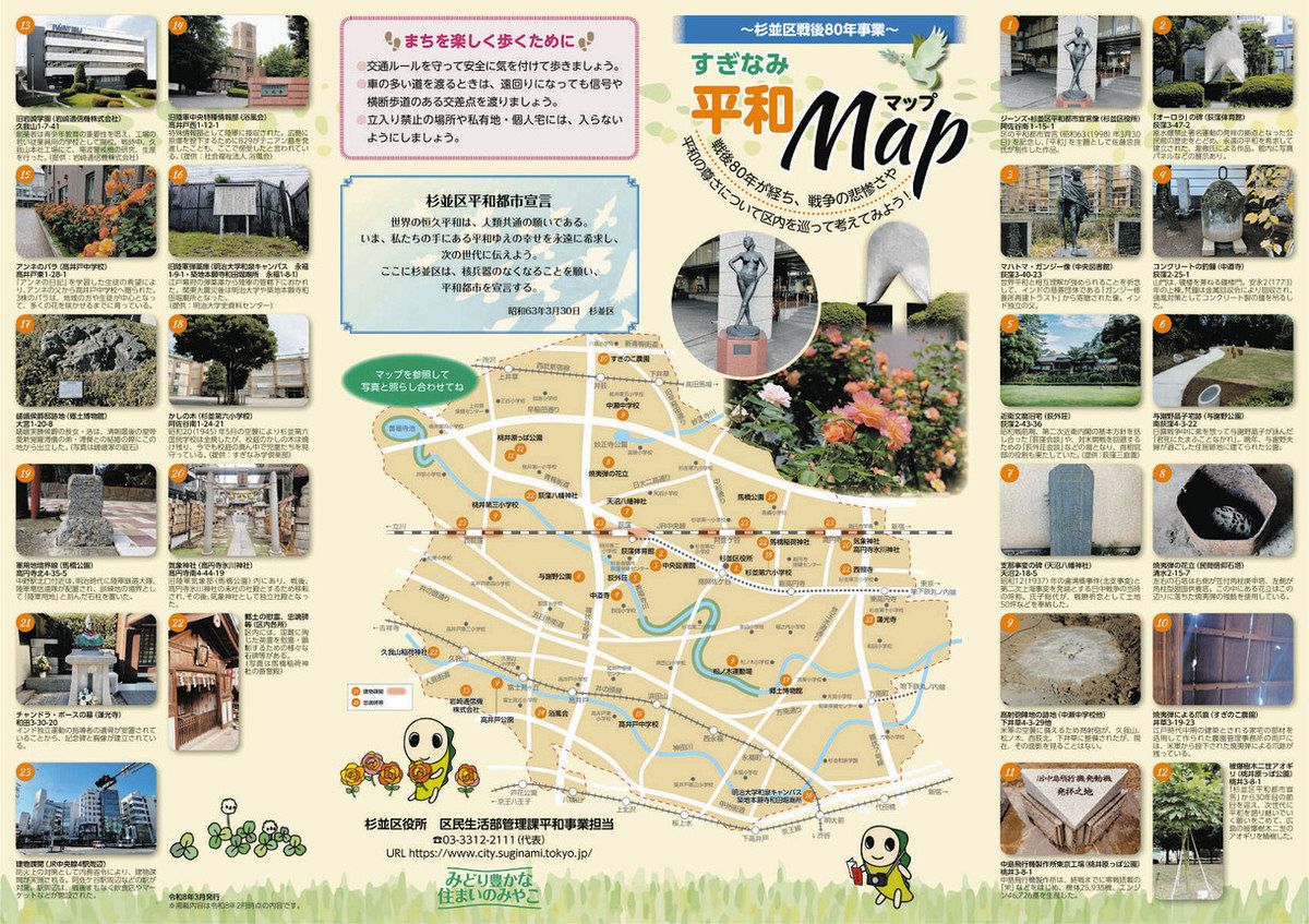 東京都杉並区は、区内の戦争遺構や平和を象徴するスポットをまとめた「すぎなみ平和マップ」を作成し、3月から配布を始めた。区内に点在する身近なスポットを巡ってもらうことで、「平和の尊さを改めて感じてもらうきっかけにしてもらいたい」と呼びかけている。(佐藤航)