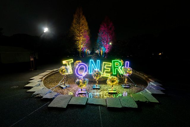 春の花の華やかさをさらに彩るのは、ネオンライトとミラー素材を融合させた「TONERI」のレターサイン。ここから、花と光が織りなす幻想的な世界が始まります。提供:(公財)東京都公園協会