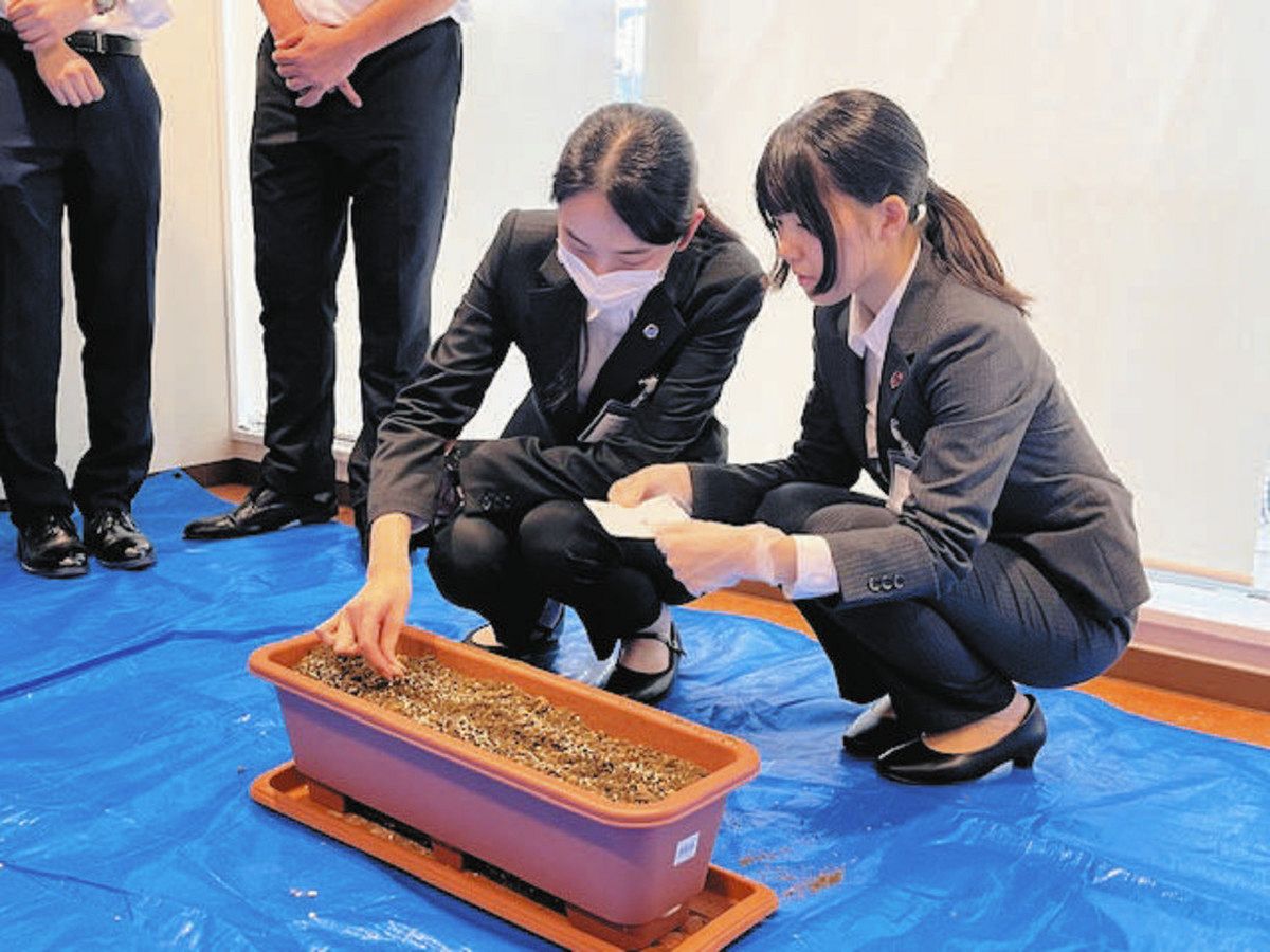 プランターにヨモギの種をまく足立成和信金の新入職員=足立区の同信金中央支店で