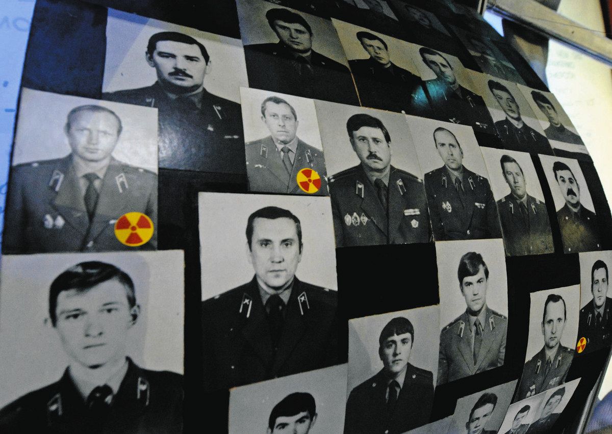 事故収束に参加した消防士や作業員たちの肖像=ウクライナ・キーウのチェルノブイリ博物館で(2015年11月撮影)
